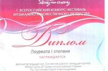 10 апреля учащиеся класса Галямовой Марии Александровны приняли участие в I Всероссийском конкуре-фестивале музыкально-художественного творчества "Хочу на сцену". Все заявленные 11 номеров завоевали призовые места: театр детской эстрадной песни "Обыкновенное чудо"- обладатель ГРАН-ПРИ; детский эстрадный хор "Солнечная дорога" - Лауреат I степени; дуэт Яровикова Арина и Галимова Камилла - Лауреат II степени; в номинации соло: Яровикова Арина, Галимова Камила,Сулейманова Айсылу, Михайлова Жанна - Лауреаты II степени, Мгоян Тиффани, Кокорева Дарья, Морозова Дарья, Даулятшина Айгуль - Лауреаты III степени. Поздравляем всех с победой!!!