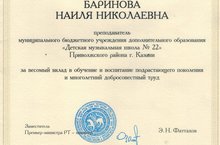 Так же поздравляем нашего преподавателя скрипки Баринову Наилю Николаевну с награждением Почетной грамотой Министерства образования и науки РТ.