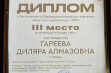 Воспитанница объединения «Студия юных журналистов» - Гареева Диляра Алмазовна, которая заняла 3 место в номинации «Лучшее СМИ» под руководством Баканова Романа Петровича.