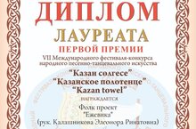 Юные дарования, Элеоноры Ринатовны Калашниковой, Фолк проект «Ежевика» приняли участие в VII Международном фестивале-конкурсе народного песенно-танцевального искусства «Казан cөлгесе» и стали Лауреатами первой премии.