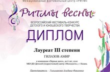 Во Всероссийском фестиваль-конкурсе детского и юношеского творчества "Ритмы весны" в номинации "Первые шаги", до 6 лет, соло" - Гилазов Амир (объединение "Вокальный ансамбль "ДоРеMix", педагог дополнительного образования Гильманова А.Ф.) стал Лауреатом III степени. Поздравляем!