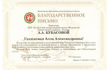 Директор нашего Центра Кубасова А.А. награждена Благодарственным письмом от Министерство образования и науки РТ за весомый вклад в систему образования и воспитания подрастающего поколения и многолетний добросовестный труд. Поздравляем и желаем новых творческих успехов и дальнейших лет плодотворной работы.