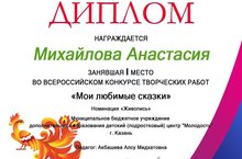 Воспитанница объединения "Юный дизайнер" Михайлова Анастасия заняла 1 место во Всероссийском конкурсе творческих работ "Мои любимые сказки" в номинации "Живопись". Поздравляем!