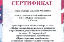 Миннегалиева Эльмира Рамилевна Приняла участие в работе семинара по теме: "Эффективные формы работы с педагогами в организации дополнительного образования" (в рамках 3 Всероссийской научно-практической конференции "Проектирование новой школы: реализация образовательных стандартов" по направлению "Дополнительное образование")