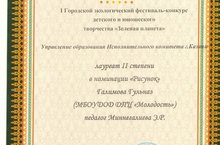 05.12.14Воспитанники объединения «Вокал» и «Модные аксессуары», принявшие участие в Городском экологическом фестивале – конкурсе детского и юношеского творчества «Зеленая планета» - были награждены почетными грамотами.ЗариповаАйсылу номинация «Текстиль» - ЛауреатI степени, ГалимоваГульназ номинация «Рисунок» -Лауреат II степени , Афлятунова Малика номинация «Вокал»- Дипломант- I степени.