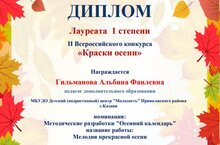 Педагог дополнительного образования Гильманова Альбина Фаилевна приняла участие во II Всероссийском конкурсе "Краски осени" в номинации методические разработки "осенний календарь", где стала Лауреатом I степени. Поздравляем! Желаем дальнейших творческих успехов!