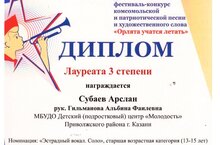По итогам IV Всероссийского детско-юношеского фестиваль-конкурса комсомольской и патриотической песни "Орлята учатся летать" воспитанник ДПЦ "Молодость" объединения "Вокальный ансамбль "ДоРеMix" (педагог - Гильманова Альбина Фаилевна) Субаев Арслан стал Лауреатом III степени. Поздравляем!