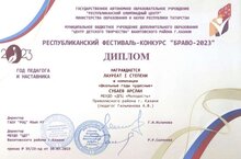 По итогам Республиканского фестиваль-конкурса "Браво-2023" учащийся объединения "Вокальный ансамбль "ДоРеMix" Субаев Арслан стал Лауреатом I степени в номинации "Школьные годы чудесные" и педагог дополнительного образования Гильманова А.Ф. стала дипломантом II степени в номинации "Методическая копилка". Поздравляем!