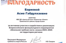 Благодарственное письмо Директору МБУДО ЦДТ "Олимп" от Президента Федерации гребного спорта Российской Федерации