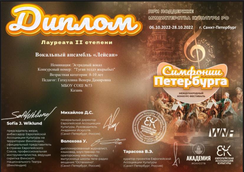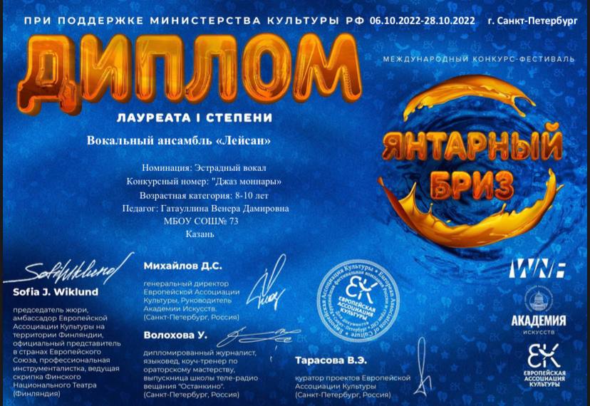 Опубликовано: 16.11.202214 ноября при поддержки Министерства культуры Российский Федерации состоялся Международный онлайн-конкурс "Симфонии Петербурга" и "Янтарный бриз" (г. Санкт-Петербург). Школьный вокальный ансамбль «Лейсан» (рук.Гатауллина Венера Дамировна) стал лауреатом 1 и 2 степени. Поздравляем Желаем дальнейших побед нашим юным вокалистам!