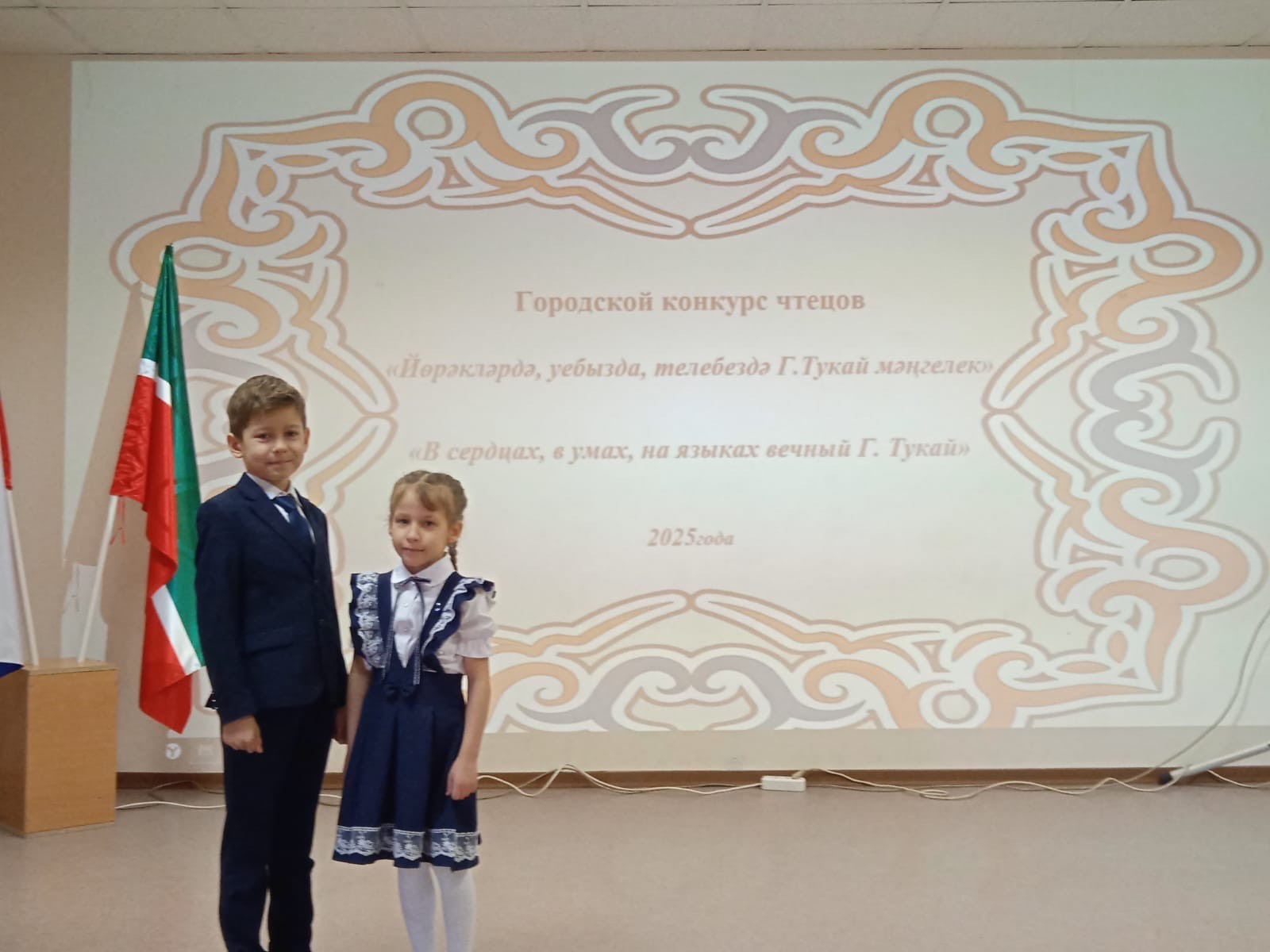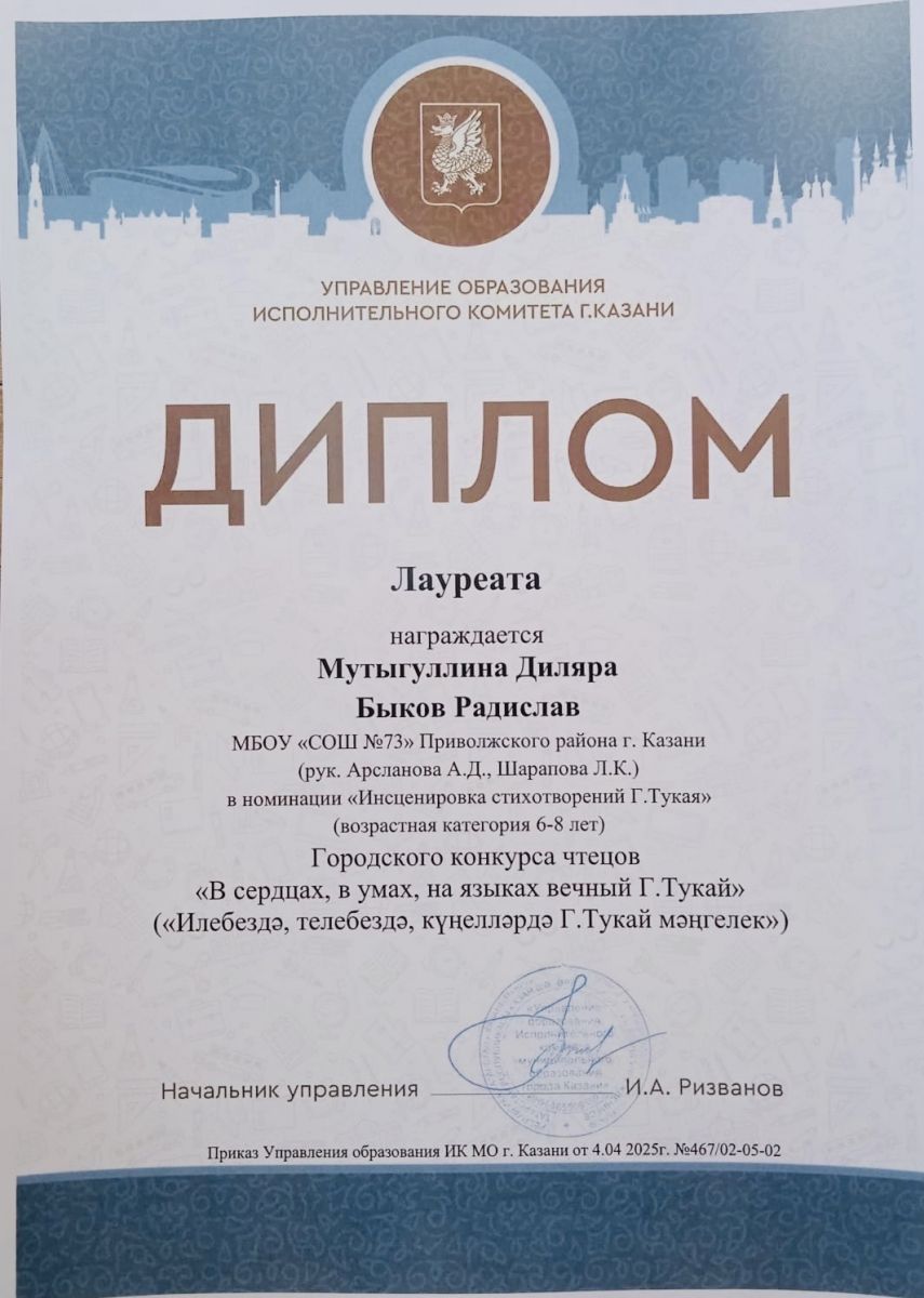 Опубликовано: 07.04.2025Мы рады сообщить, что наши ученики Мутыгуллина Диляра (1а) и Быков Радислав (2б) успешно приняли участие в городском конкурсе чтецов «В сердцах, в умах, на языках — вечный Г.Тукай». Они стали Лауреатами этого замечательного мероприятия! На районном этапе конкурса наши ребята заняли второе место, продемонстрировав свои выдающиеся способности и любовь к родному языку. Особую благодарность выражаем нашим замечательным учителям родного языка: Шараповой Лилии Каюмовне и Арслановец Анисе Даулеевне. Ваш труд и поддержка вдохновляют наших учеников на новые достижения! Поздравляем всех с этим замечательным успехом!