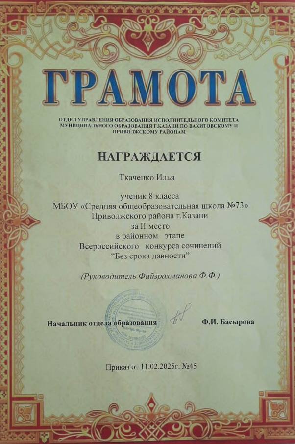 -Конкурс сочинений «Без срока давности»: Особую гордость вызывает успех ученика 8 класса Ткаченко Ильи, который занял 2 место в районном этапе Всероссийского конкурса сочинений. Его руководитель, учитель русского языка и литературы Фарида Фаридовна, заслуживает отдельной похвалы за подготовку!