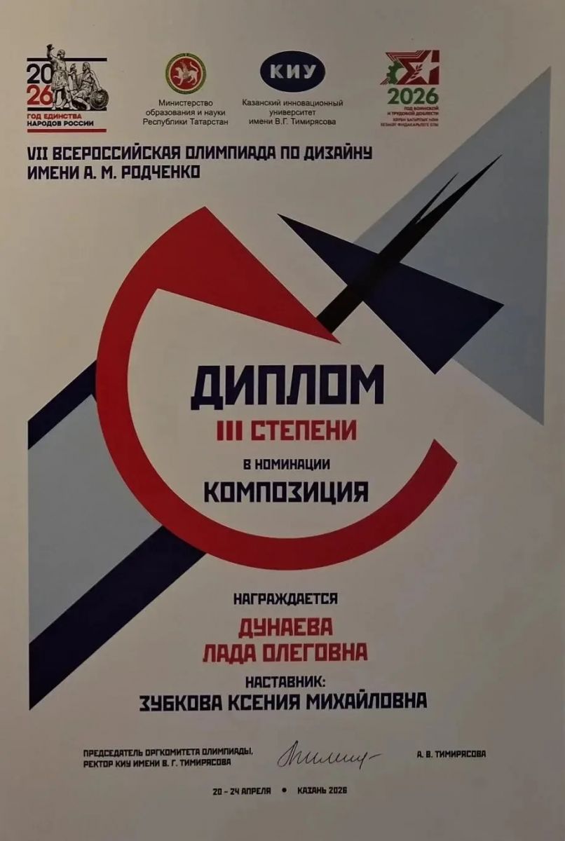 Опубликовано: 27.04.2026Поздравляем Дунаеву Ладу, ученицу 2 класса, с бронзой во Всероссийской олимпиаде А. М. Родченко!