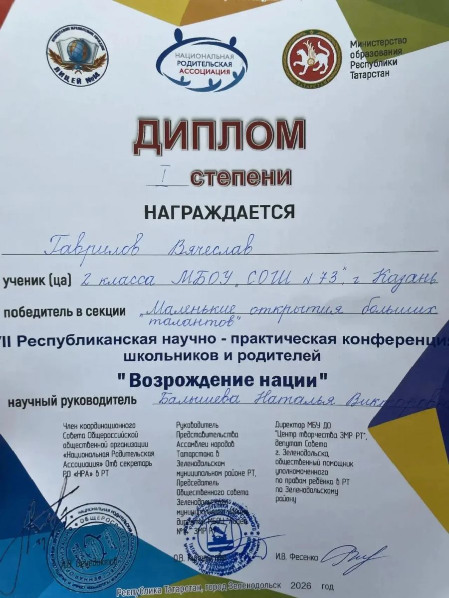 Опубликовано: 26.04.2026Ученик 2 класса Гаврилов Слава принял участие в Республиканской научно-практической конференции школьников и родителей «Возрождение нации», которая прошла в городе Зеленодольск.