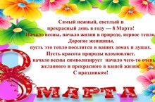 8 марта - это праздник, который символизирует приход весны. в этот день ни одна женщина не должна остаться без внимания! Дети всех возрастных групп нашего детского сада подарили своим мамам и бабушкам замечательные утренники и подарочки, сделанные своими руками.В своих стихах и песнях они рассказали о своей любви к самым близким и дорогим людям. Мамы, бабушки, девочки активно участвовали во всех конкурсах. Также постарались папочки наших воспитанников, и для каждой мамы приготовили сюрпризы. Праздник получился очень интересным, ярким, незабываемым!