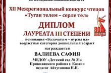 Наши воспитанники Гаффарова Камиля и Валиева Сафия под руководством воспитателя по обучению татарскому языку Айтугановой Н.Н. приняли участие в XII Межрегиональном конкурсе чтецов "Туган телем - серле тел".