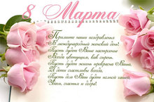 Дорогие женщины, поздравляем Вас с Международным женским днем! Желаем Вам тепла и любви в сердцах, замечательного настроения и прекрасного самочувствия. Будьте красивы, счастливы, дарите улыбки, радуйтесь и получайте замечательные впечатления. Вы очаровательны! С праздником!
