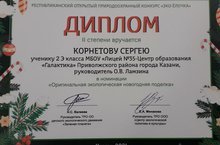 Среди победителей был ученик 2 класса нашего лицея Сергей Корнетов, который занял 2 место в номинации «Оригинальная экологическая новогодняя поделка».