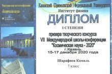 Поздравляем ученика 7 А класса Шарафиева Камиля, получившего 1 место в международном творческом конкурсе «Космическая наука», который проходил 15-17 декабря в КФУ. Руководитель: Гилязева А.А. Желаем дальнейших успехов!