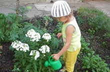 Все лето воспитатели вместе с детьми ухаживали за цветами: поливали, рыхлили землю вокруг цветов, боролись с сорняками...