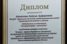 Сегодня было выручение дипломов и подарков в государственном бюджетном учреждении "Безопасность дорожного движения". Они проводили районный конкурс макетов "В мире правил дорожного движения". Поздравляем воспитателя Камалову Ляйсан Зуфаровну с номинацией "Лучший макет-тренажер".
