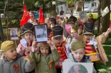 Наши сотрудники и воспитанники держа в руках портреты своих героических предков, прошли торжественным строем по территории детского сада.