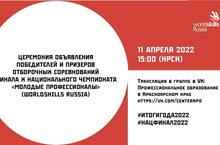 11 апреля 2022 года в онлайн формате состоялась церемония награждения победителей и призеров Итоговых соревнований, приравненных к Финалу Национального чемпионата «Молодые профессионалы» (WorldSkills Russia) 2022 по компетенции «Ювелирное дело» и «Ювелирное дело – Юниоры».