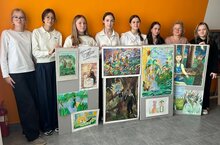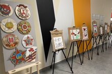Также в фойе РДК была организована выставка работ декоративно-прикладного и изобразительного искусства, выполненная обучающимися Миннегалеевой Л.Р., посвященная 80-летию Победы, а также работы учащихся выпускного класса Якуповой Ф.Х.