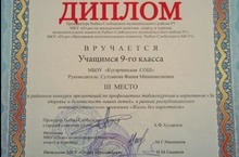 Учащиеся 9 класса с классным руководителем Султановой Ф.М. приняли участие в антинаркотическом конкурсе "Жизнь без наркотиков" и завоевали III место в конкурсе презентаций по профилактике табакокурения и наркотиков "За здоровье и безопасность наших детей" .