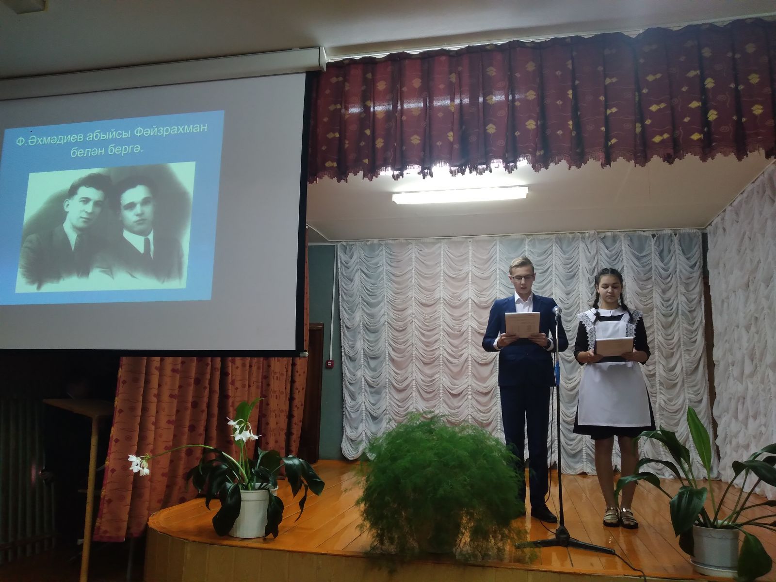 16 ноября-День рождения нашего земляка композитора Фатхерахмана Ахмадиева. В связи с этим был проведен классный час, посвященный его памяти. В перерывах звучали такие песни, как “Кояш гомере ”, “Солдатлар”, “Ромашкалар”, “Җилләр,җилләр”, “Чистай вальсы”, “Яшисе килә”. Песни и мелодии Фатхерахмана Ахмадеева в свое время с любовью пел и слушал весь татарский народ. И сейчас люди с удовольствием поют и слушают его песни