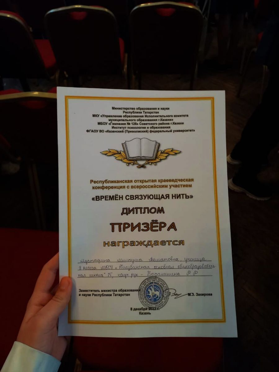 Опубликовано: 11.12.2023Мустафина Миляуша, обучающихся детского объединения "Краеведение" набазе МБОУ " Юлсубинская ООШ" 8 декабря приняла участие в Республиканской открытой кваеведческой конференции со Всероссийским участием,"Времен связующая нить" и получила Диплом призера. Руководитель- педагог дополнительного образования Бадамшина Файруза.Поздравляем с успешным выступлением!