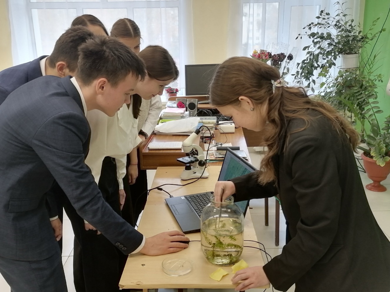 С помощью цифрового микроскопа учащиеся изучают движение цитоплазмы. Дети вовлечены в совместную деятельность, проявляют заинтересованность.