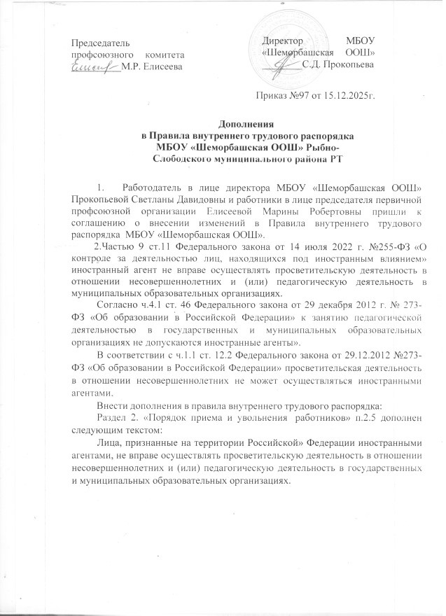9. Правила внутреннего трудового распорядка школы Дополнения в Правила трудового распорядка