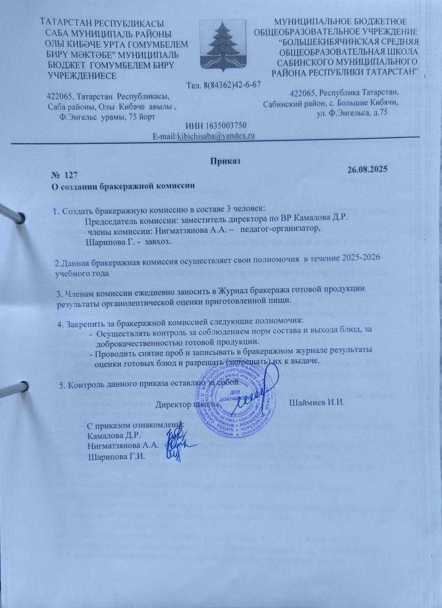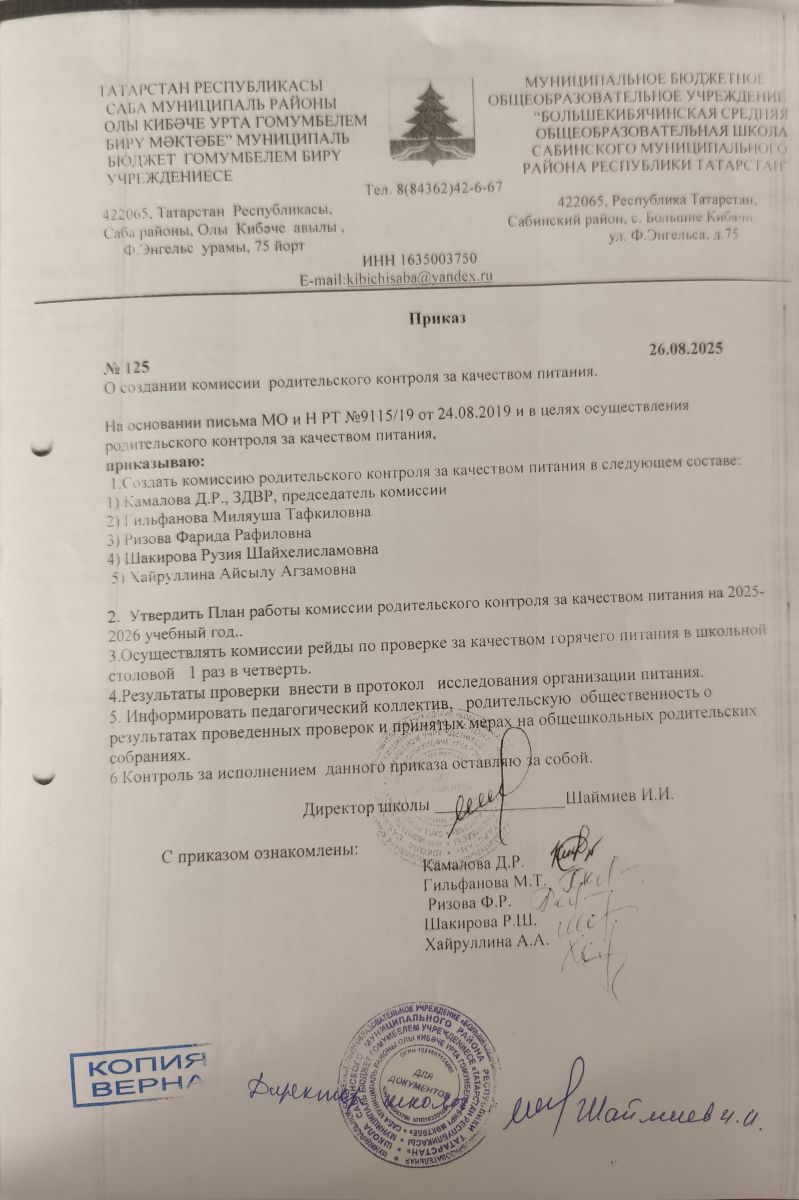 Приказ о создании комиссии родительского контроля за качеством питания на 2025-2026 учебный год