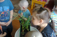 Балалар белән көн саен карап торып суган һәм укроп үстерәбез. Балалар хәттә суганны күзәтеп кенә түгел, иснәптә торалар.