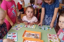 Зурлар һәм мәктәпкә әзерлек төркеме балалары математика өйрәнгәндә кечкенәләр лото уенын уйныйлар.