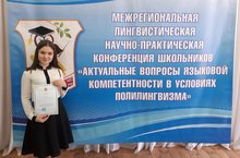 В целях развития творческого потенциала учащихся, выявления талантливых, одаренных детей и приобщения их к исследовательской, творческой деятельности в различных областях языкознания, привлечения общественного внимания к проблемам сохранения и развития языков в условиях поликультурного пространства 22 февраля на базе МАОУ «Гимназия №76» г. Набережные Челны прошла V межрегиональная лингвистическая научно-практическая конференция «Актуальные вопросы языковой компетентности в условиях полилингвизма». Ученица 10 класса нашей школы Осипова Ангелина приняла участие в работе секции «Сопоставительная грамматика» и заняла 3 место. Поздравляем ее с победой и желаем дальнейших успехов!