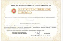 Директор школы Билалова Ляйсан Ракиповна и коллектив награждены Благодарственным письмом Министерства образования и науки РТ за мастерство, добросовестный и творческий труд, верность профессии и значимый вклад в развитие олимпиадного движения в республике. -