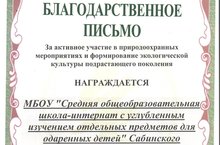 За активное участие в природоохранных мероприятиях и формирование экологической культуры подрастающего поколения наша школа награждена Благодарственным письмом Северного территориального Управления Министерства экологии и природных ресурсов РТ.