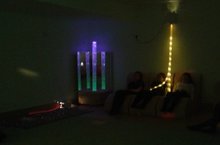 На фотографии учащиеся 6-8 классов, в сенсорной комнате, для снятия психологического напряжения. -
