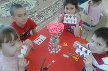Зурлар төркемендә балалар кисеп ябыштыру эшчәнлегендә салфетка ясау максатыннан симметрияле формада предметлар кисәргә өйрәнделәр ,икегә бөкләнгән кәгазьгә өчпочмак формасын ясап ромбик кистеләр, сурәтләрне кәгазь битендә дөрес итеп урнаштырдылар,эш барышында балаларның кайчы белән дөрес эшләү күнекмәләрен камилләштерелде, эшләренә анализ ясалды. (Тәрбияче: Солтанова Г.Г)