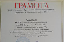 Воспитанники старшей группы нашего детского сада участвовали в районном конкурсе инсценирования художественных произведений среди воспитанников дошкольных образовательных учреждений, который прошёл 2 июня. Детский сад награждён Грамотой МКУ "Управление образования Исполнительного комитета Сабинского муниципального района РТ" в номинации "Старая сказка на новый лад".
