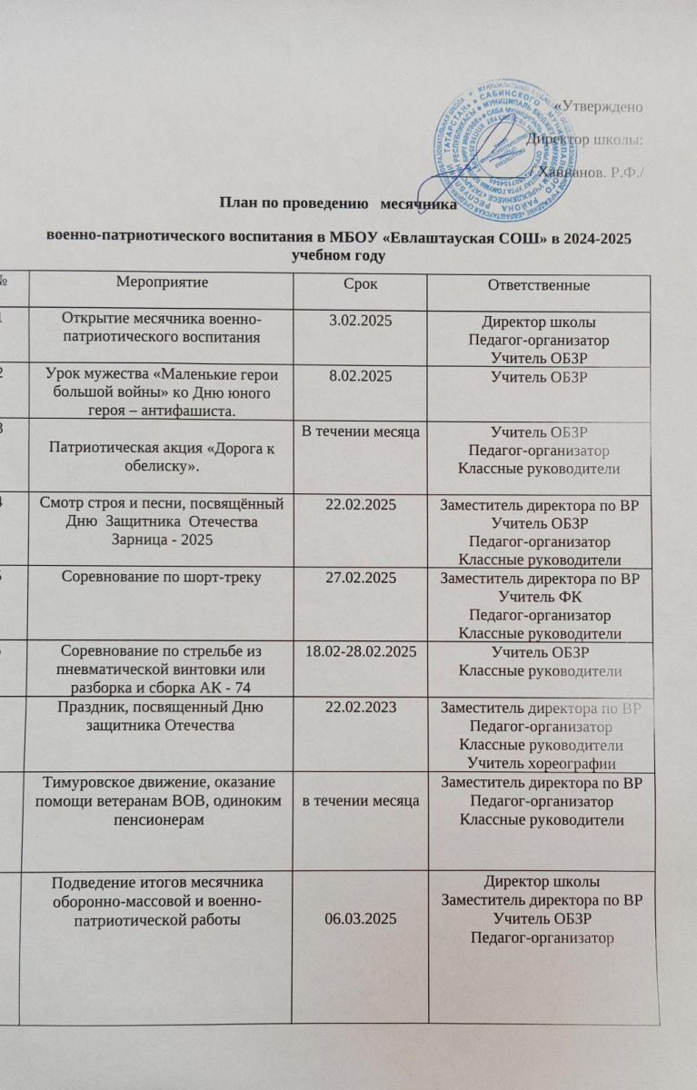 План мероприятий МБОУ "Евлаштауская СОШ" к Году защитника Отечества