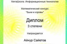 Ученик 8б класса Саетов Айнур участвовал в Всероссийском математическом конкурсе "Быки и коровы". Награжден дипломом 3 степени. Молодец! Желаем дальнейших успехов!