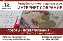 Родительское интернет – собрание 15.12.2017 Департамент надзора и контроля в сфере образования совместно с Казанским инновационным университетом имени В.Г.Тимирясова (ИЭУП) планирует провести 15 декабря 2017 года Республиканское родительское интернет – собрание по теме «Поборы и пожертвования – что общего и в чем различия?», где будут рассмотрены актуальные вопросы, касающиеся незаконных сборов денежных средств с родителей (законных представителей) обучающихся (воспитанников) образовательных организаций РТ, а также законные способы внебюджетного финансирования (добровольные пожертвования, благотворительность, спонсорская помощь, целевые взносы). Второе по счету Республиканское родительское интернет – собрание пройдет в формате видеоконференции. Он-лайн трансляция собрания будет вестись на сайте Казанского инновационного университета имени В.Г.Тимирясова по адресу: https://ieml.ru/. Приглашаем Вас принять участие во II Республиканском родительском интернет – собрании путем подключения к трансляции.