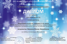 Творческий коллектив учащихся 9 «Б» класса и руководитель Маканова Мадина Миннебаевна являются победителями III Всероссийского конкурса творческих работ «Зимнее вдохновение». Награждены Дипломом победителя - за победу в номинации «Мои поделки».