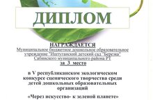 Наши воспитанники принимали участие в V республиканском экологическом конкурсе сценического творчества среди детей дошкольных образовательных организации "Через искусство - к зеленой планете". И награждены дипломом за 3 место.