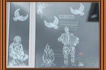 На окнах появились изображения солдат, георгиевских лент, вечного огня, голубей мира, журавлей и других символов, связанных с Победой.