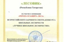 Министерство природных ресурсов и экологии Российской Федерации, Федеральное агентство лесного хозяйства провёл Всероссийский заочный смотр-конкурс школьных лесничеств «Лучшее школьное лесничество». Школьное лесничество нашей школы «Лесовик» (рук. Николаева О.В.) принял участие в номинациях «Лесовосстановление», «Охрана и защита леса» и награждён Сертификатами.