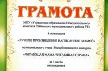 Наши ученики Мингариев Амир (1 кл.), Шарипова Арина (2 кл.), Иванов Роман (6 кл.) совместно со своими мамами приняли участие в муниципальном этапе Республиканского конкурса «ЧИТАЮЩАЯ МАМА – ЧИТАЮЩАЯ СТРАНА». Они награждены Грамотами в номинациях: «Лучшее произведение, написанное мамой», «Читаем вместе с мамой», «Читающая мама».